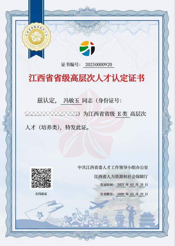 近日,经个人申报、组织审定等程序,南昌市局正研级高工冯敏玉被省委人才办、省人力资源社会保障厅认定为省级高层次E类优秀基础人才。此次取得省级高层次人才认定,既是对冯敏玉个人能力和业绩的充分肯定,也是南昌市局人才队伍建设的重要成果。